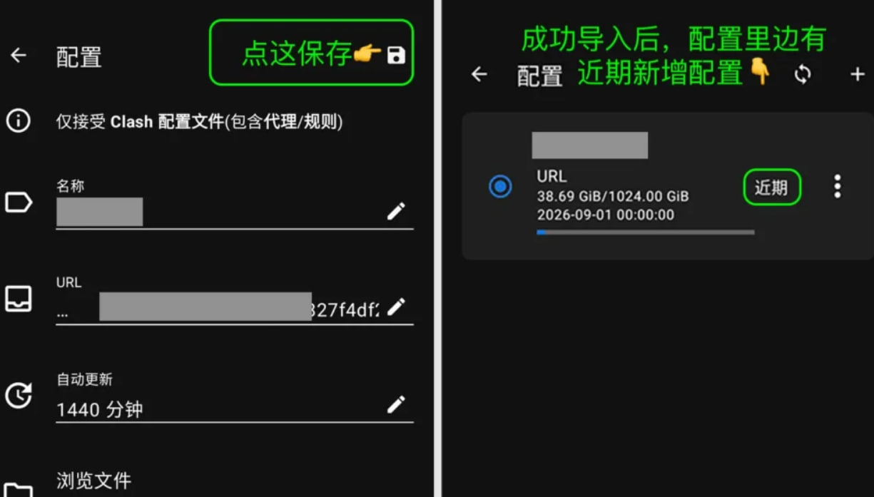 1. 成功保存后会回到首页。点击配置就能看到:新配置(几秒前),这就表示已成功导入Clash节点订阅啦,